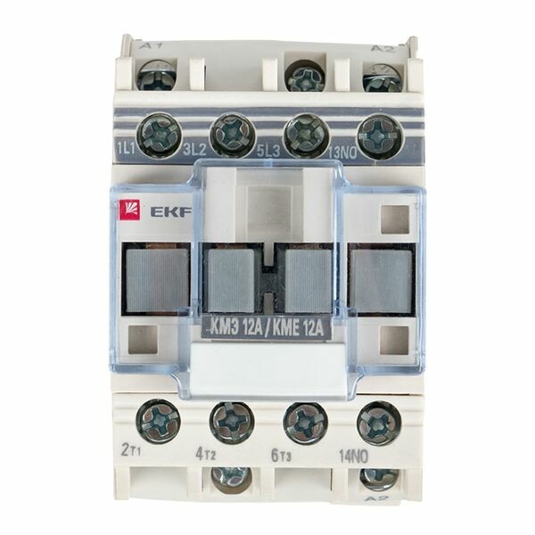 Контакторы КМЭ EKF PROxima состоят из корпуса, закрепленных в нем неподвижных контактов, подвижных контактов, которые закреплены в подвижной части магнитной системы. Неподвижная часть магнитной системы закреплена жестко в корпусе КМЭ. Пружина препятствует смыканию контактов. При подаче напряжения на катушку управления в магнитной системе контактора возникает магнитное поле, которое, преодолевая сопротивление пружины, смыкает магнитную систему и замыкает контакты. При отключении напряжения с катушки управления пружина размыкает контакты. Возможна коммутация алюминиевым и медным проводом.