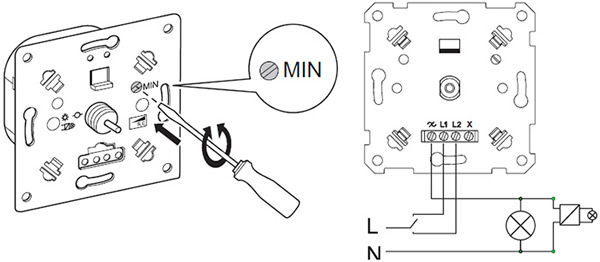 Диммер может быть установлен в монтажную коробку с помощью винтов или распорных лапок.