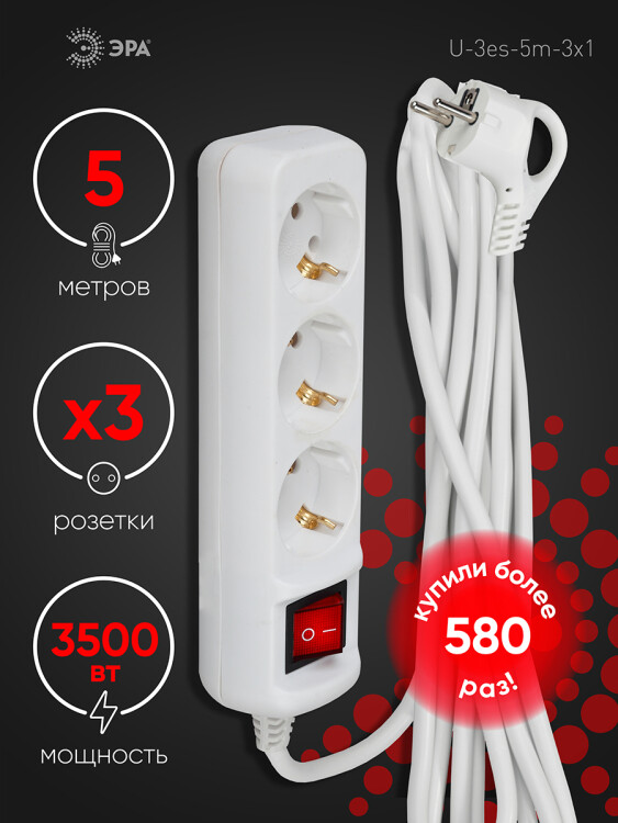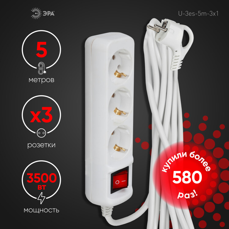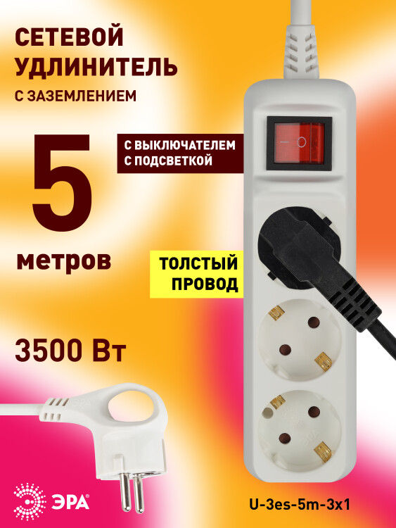 Удлинитель трехместный 5 м "Эра" U-3es-5m-3x1 (16 А, 250 В, ПВС 3 х 1 кв.мм) с заземлением, с выключателем, белый