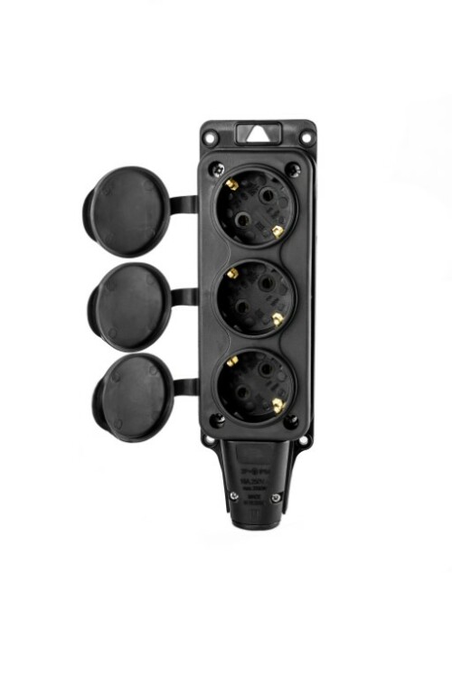 Колодка трехместная PlexUp ERK23-16-02-54 (16 А, каучук, IP54) с заземлением, с защитными крышками, черный