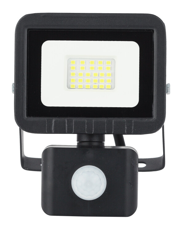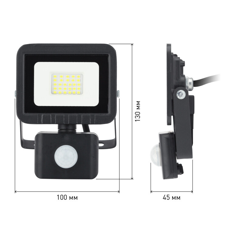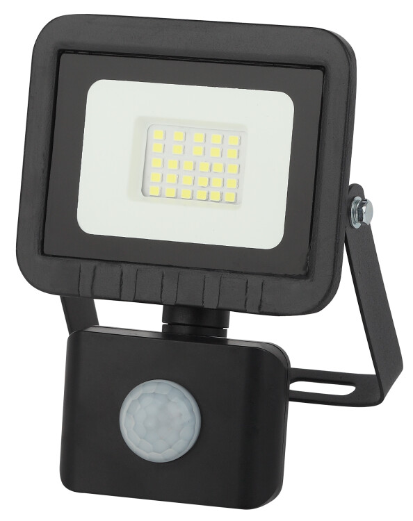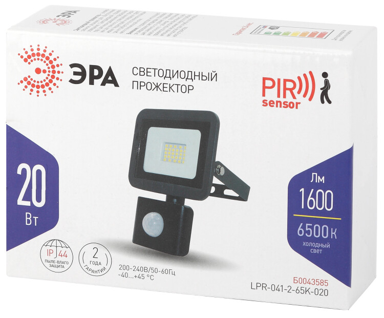 Прожектор светодиодный уличный с выносным регулируемым датчиком движения (СДО) ЭРА LPR-041-2-65K-020 мощность 20 Вт, с цветовой температурой 6500К (холодный белый свет), пылевлагозащитой IP65 (защищен от пыли и струй воды с любого направления), световым потоком 1600 Лм. Инфракрасный датчик реагирует на движение в зоне действия (радиус срабатывания от 1 до 8м) и автоматически включает освещение (время задержки от 5сек до 8мин). Корпус изготовлен из анодированного алюминия с покраской в черный цвет. Стекло - закаленное. LED технология обеспечивает длительный срок службы и экономию электроэнергии. Светильник работает в широком диапазоне рабочих напряжений - 200-240В, а также широком диапазоне температу от -45 до +40 - подходит как для внутреннего, так и наружного применения. Предназначен как для промышленного, так и для бытового освещения: дворов, подсобных помещений, приусадебных хозяйств, билбородов, в качестве уличного фонаря.