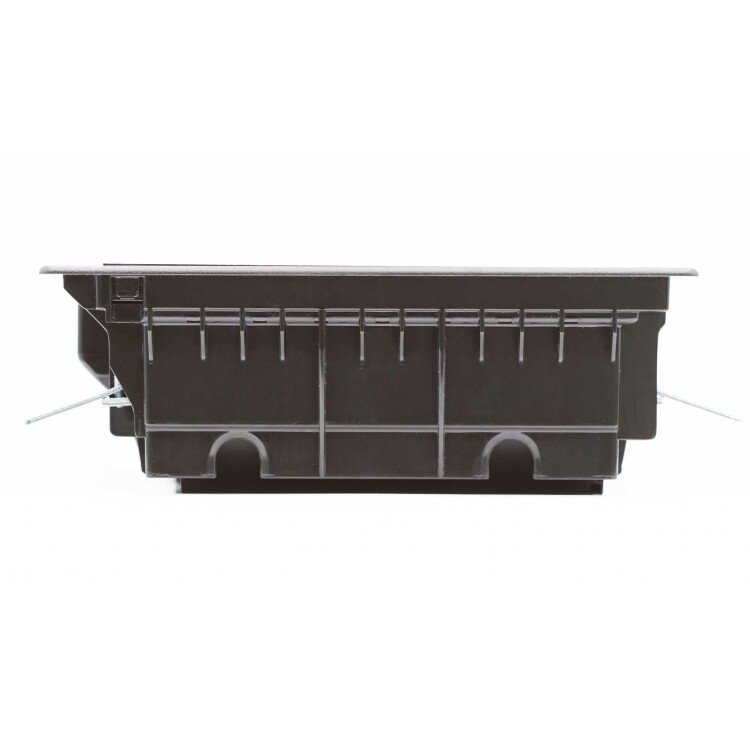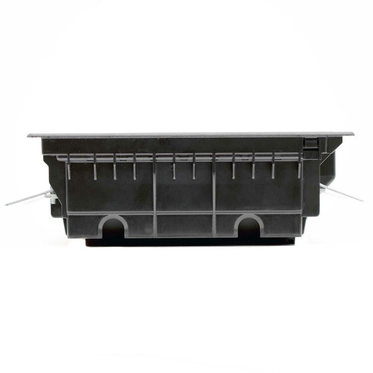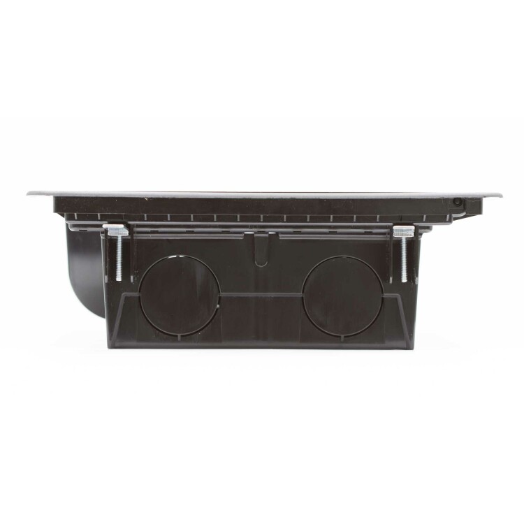 Назначение: организация рабочих мест в открытом интерьере. Устанавливается в фальшполах (толщина плит 20-40 мм), отверстие в полу 345×255 мм, закрепляется невыпадающими фиксаторами. Характеристики: глубина от уровня пола − 92 мм, высота над уровнем пола (толщина рамки): 3 мм, ширина рамки (ободка по периметру) сверху — 20 мм, снизу — 12 мм, крышка лючка утоплена на 7,5 мм для напольного покрытия, крышка со стальным листом, нагрузка: на малую площадь − 1000Н, на большую площадь — 2000Н (ГОСТ 61084-2-2-2022), допустимая нагрузка на крышку 450 кг (ГОСТ 61084-2-2-2007), открывается на угол 110°; В лючок возможна установка ЭУИ «Avanti»,"Brava», ЭУИ «Вива» (Viva), стандарта 45×45 мм с 2 сторон; трубы вводятся диаметром до 40 мм по 2 шт. с 2 сторон. Комплект поставки указан в инструкции. Цвет — чёрный.