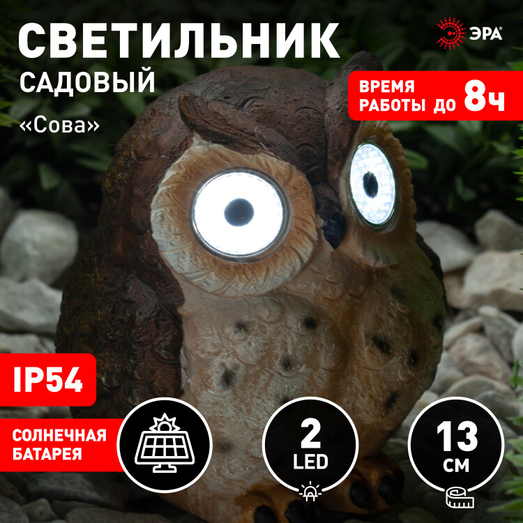 Беспроводной светодиодный светильник ERAFYS01-12 "Сова" станет фаворитом среди декоративного освещения в Вашем саду. Небольшие внешние размеры позволят Вам расположить подсветку в палисаднике, украсить пруд, территорию около бассейна, альпийскую горку, эффектно подсветить клумбу. Фигурка из полистоуна высотой 13 см без труда устанавливается в землю. LED светильник работает на солнечной батарее. Такой тип получения энергии является наиболее экологичным, энергоемким, а также бесшумным. Питание происходит во включенном режиме, в светлое время суток. С наступлением темноты причудливая совушка загорается. Участок вокруг нее начинает освещаться холодным белым светом, исходящим из глаз. Вы окунетесь в атмосферу волшебства. Яркие цвета и четкая проработка деталей придают светильнику реалистичности. Обращаем Ваше внимание, что перед использованием фигурки её необходимо включить и зарядить. Светильник заряжается в течение всего светового дня. Солнечная батарея предусматривает 8 часов непрерывной работы. Высокая степень защиты от пыли и влаги позволяет оставлять фигурку в саду даже в дождь. Садово-парковый декоративный светильник от бренда ЭРА прекрасный вариант для преображения Вашего сада.