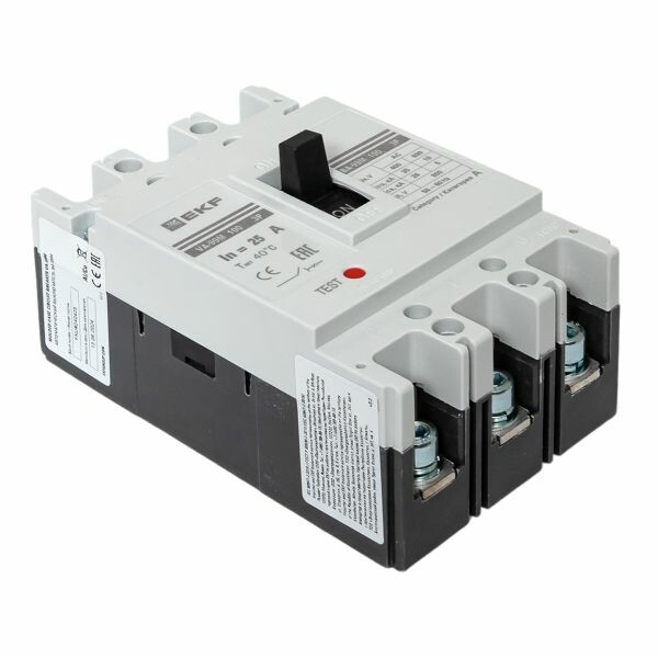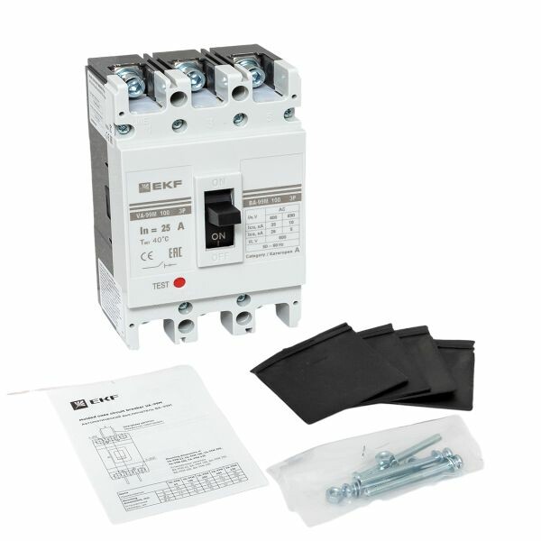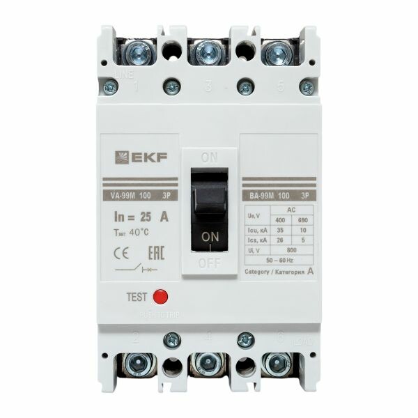 Выключатель ВА-99М выполнен в виде моноблока и состоит из основания и крышки с фальшпанелью, в которой имеется окно для рукоятки управления и толкатель кнопки «Тест» - проверки механизма отключения выключателя. Основание выполнено из термостойкой пластмассы, не поддерживающей горение и являющейся несущей конструкцией для присоединительных зажимов, неподвижных и подвижных контактов с системой дугогашения, механизма управления, блока защиты от сверхтоков. Крышка закрывает все подвижные элементы механизма управления и внутренние токоведущие части.