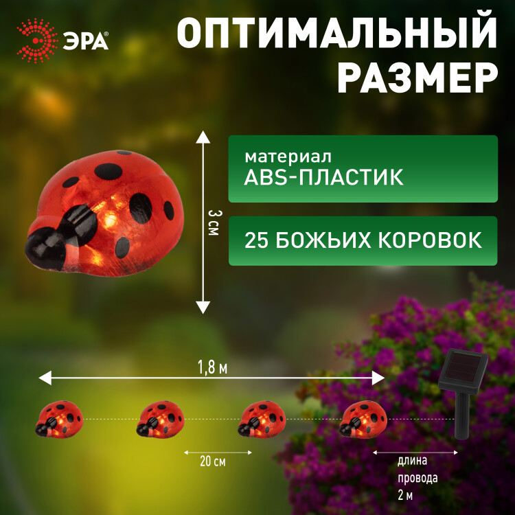 Садовая гирлянда Божьи коровки на солнечной батарее 7м (длина рабочей части 5 метров) 2 режима 25 LED ЭРА ERASF23-19