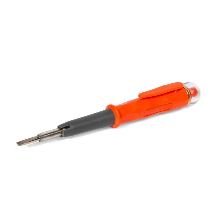 Тестер для контактного или бесконтактного определения наличия переменного напряжения в диапазоне от 100 до 500 В.Защитный вращающийся колпачок на контактном электроде тестера.Бесконтактное определение напряжения возможно как при закрытом, так и при открытом электроде.Для увеличения чувствительности тестера прикоснитесь к металлическому кольцу.Клипса для крепления к карману.Индикаторная лампочка выполняет функцию подсветки.Прочный пластиковый корпус.Вес: 24 г.Длина: 153 мм.