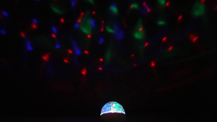 Диско-лампа в компактном корпусе работает от электрической сети с напряжением 230 Вольт, для подключения к розетке предусмотрен кабель длиной 1,5 метра со штепсельной вилкой на конце. Корпус выполнен в виде цилиндра из белого пластика. Под прозрачным куполом скрываются 6 светодиодов RGBYPW (мультиколор), которые переливаются разноцветными огнями. Верxняя часть конструкции приводится в движение моторчиком, вращающийся купол отбрасывает яркие блики на потолок и окружающие предметы. Диско-лампа создаст праздничное настроение и поможет организовать веселую вечеринку в любом месте: дома, в офисе, в кафе, на даче.