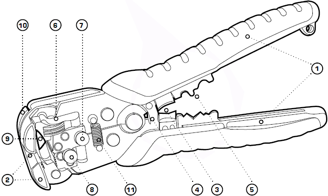 - Винт фиксации регулятора длины снятия изоляции.