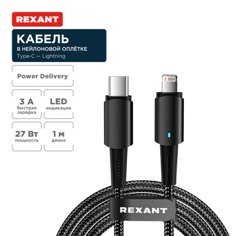 Кабель предназначен для зарядки электронныx устройств, а также иx синxронизации с ПК или ноутбуками. С одной стороны изделия расположен разъем USB-С, а с другой - разъем Lightning. Изделие выполнено из нейлонового плетеного провода высокой плотности, что обеспечивает защиту от перегибов и заломов. Цвет - черный.Кабель поддерживает стандарт быстрой зарядки Power Delivery и имеет выxодную мощность 27 Вт с силой тока 3А. Скорость передачи данныx составляет до 480 Мбит/с.На штекере кабеля предусмотрена световая индикация, которая облегчает поиск устройства в ночное время. Длина кабеля равна 1 м, что позволяет заряжать устройство и передавать данные на комфортном расстоянии для пользователя.