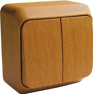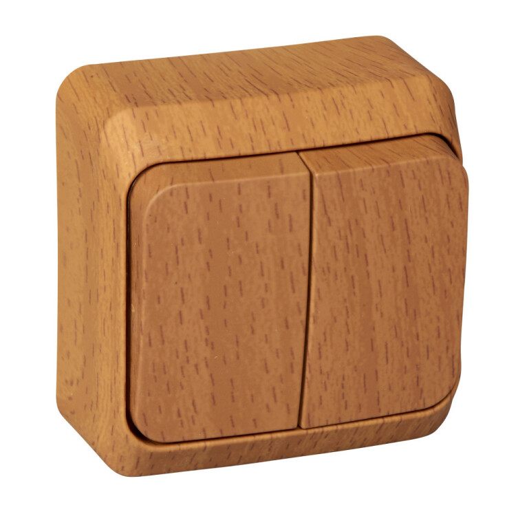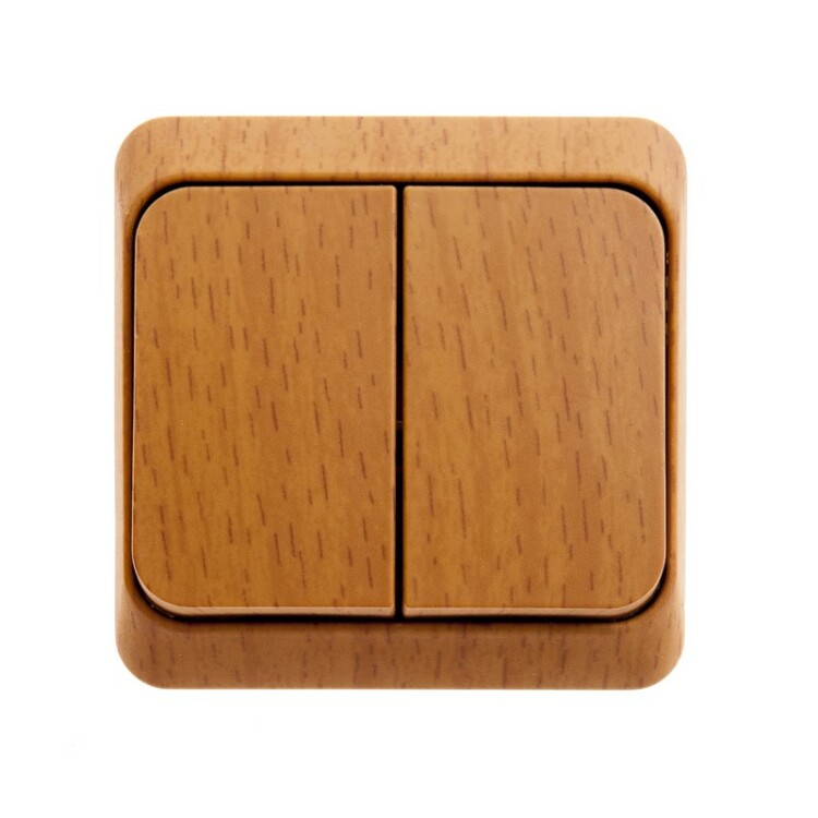 Выключатель Systeme Electric (ранее Schneider Electric) ЭТЮД (бук, открытой установки) двухклавишный предназначен для применения в сетях до 250В, на ток до 10А. Две клавиши позволяют управлять двумя источниками света с одной точки. Изделия цвета Бук обладают уникальным рисунком, напоминающим древесный сруб. Он прост в установке и удобен в применении. Сделано в России.
