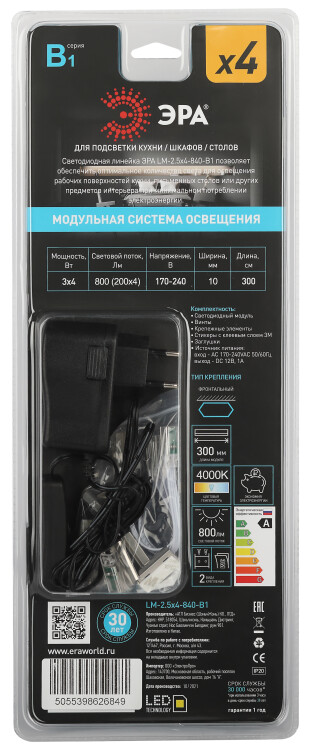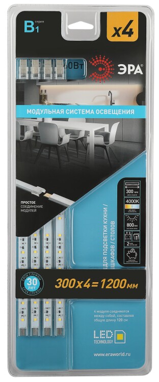 Модульная система, состоящая из 4-х светодиодных модулей. Мощность каждого модуля 3Вт. Цветовая температура 4000K. Комплектация: светильник, набор крепежных элементов, ссоед. кабель 3шт., источник питания 15Вт. Включение и выключение производится с помощью выключателя на проводе