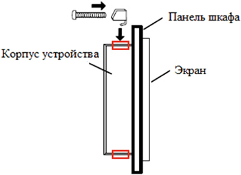 - Вставьте металлические струбцины-фиксаторы из монтажного комплекта в отверстия на корпусе устройства и затяжкой винтов зафиксируйте фиксаторы и монтируемое устройство.