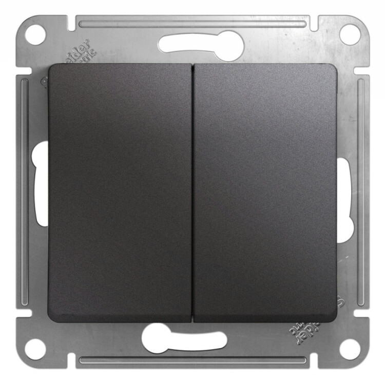 Механизм Systeme Electric (ранее Schneider Electric) серии Glossa (цвет графит) переключателя 2-клавишного подходит для сетей 250 В, на ток 10 А. Переключатель позволяет управлять одним источником света с двух точек. Выполнен из материала PС+ASA, стойкого к УФ-излучению и появлению царапин. Эргономичные клеммы расположены в два ряда: сверху и снизу.