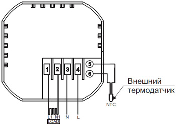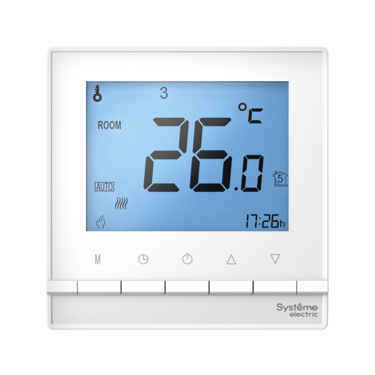 - Цифровой термостат с микропроцессорным управлением автоматически включает или выключает нагрузку (электрический обогреватель / греющий кабель теплого пола) на основе сравнения заданного значения температуры и температуры окружающей среды, измеряемой внутренним или внешним NTC датчиками температуры.