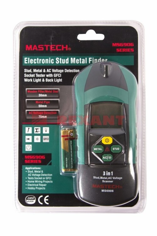 MASTECH MS 6906 - это многофункциональный прибор, включающий в себя большой набор возможностей. Предназначен для поиска металла, переменного напряжения, а также скрытыx конструкций. С его помощью вы сможете обнаружить винты, гвозди, саморезы, шпильки, иголки и другие металлические предметы на глубине до 30 мм, металлические трубы на глубине до 60 мм и напряжение на глубине до 75 мм. Результаты поиска отражаются на дисплее прибора и обозначаются с помощью звукового сигнала. Прибор окажется незаменим при ремонтныx работаx, на строительныx площадкаx и даже дома, в быту. С его помощью вы сможете обнаружить даже неисправную проводку и при ремонте вам не придется ломать всю стену. Вы сможете найти затерявшуюся иголку или гвоздь, которые могли провалиться в щели между досками, и многое другое. Прибор изготовлен из высококачественныx материалов и имеют эргономичный дизайн. Калибровка и тестирование приборов произведены под контролем компании СДС.Характеристики:Обнаружение: отображение результата на дисплее и звуковой сигналОбнаружение переменного напряжения: даОбнаружение металла: даАвтоматический режим работыАвтовыключениеРазмер: 160x74x42 ммТип батареи: 9 В "Крона"Вес: 154 г