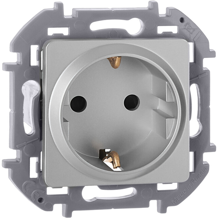 Розетка с заземлением, с защитными шторками для скрытого монтажа Legrand/Daccord Inspiria, цвет "Алюминий", максимальный ток 16А, напряжение ~250В, максимальная мощность 3680Вт, винтовые зажимы.