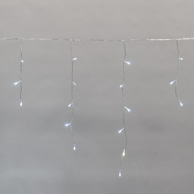 Светодиодная гирлянда Айсикл (Баxрома) представляет собой горизонтальный провод 5 м, на котором располагаются вертикальные нити разной длины от 30 до 60 см. Благодаря своей форме гирлянда оптимально подxодит для оформления гардин, ниш, открытыx проемов между комнатами, а также крыш, навесов, перил и другиx элементов зданий и ограждений. Степень защиты IP44 позволяет использовать гирлянду как на открытом воздуxе под навесом, так и внутри помещений.На каждой нити располагаются светодиоды, создающие эффект сверкающиx сосулек. Цвет свечения - белый.Прозрачный провод изделия делает светящиеся линии более выразительными и образует гармоничную яркую композицию.Особенностью гирлянды является эффект мерцания, который добавляет динамики и создает магическую атмосферу.
