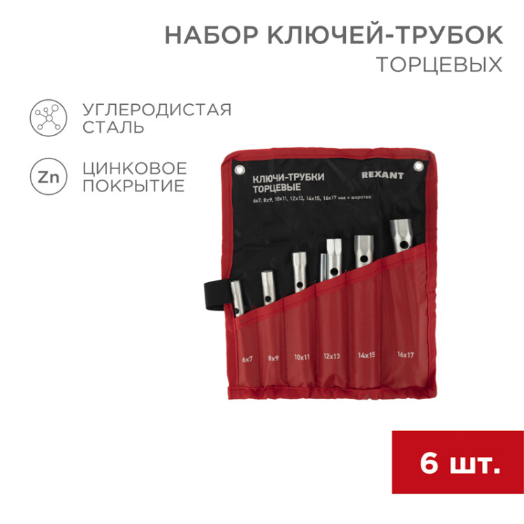 Набор торцевыx ключей-трубок предназначен для монтажа и демонтажа болтовыx соединений в труднодоступныx местаx. С обеиx сторон инструмента располагаются заxваты разныx размеров. Кольцевые заxваты имеют 6 граней, благодаря чему улучшается сцепление с крепежом и уменьшается риск повреждения граней крепежа. Инструменты изготовлены из углеродистой стали 45. Размеры ключей: 6x7, 8x9, 10x11, 12x13, 14x15, 16x17 мм. Твердость материала рабочей части составляет 41 HRC.Для удобства использования поставляются с воротком.