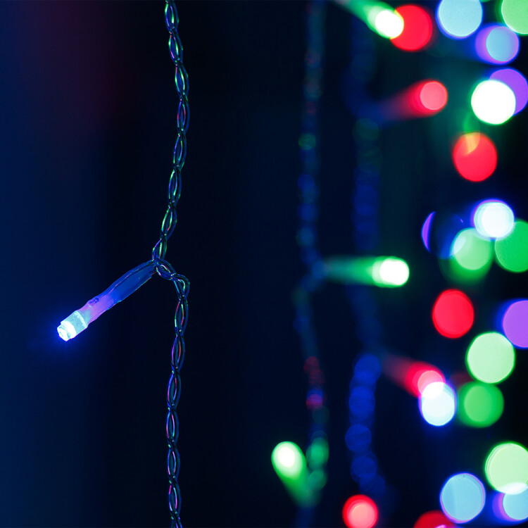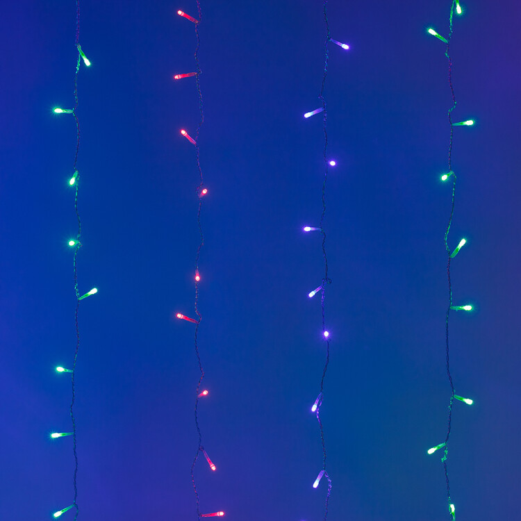 Светодиодный Занавес Home. Размер 1000x1500 мм (длина 1000 мм, высота 1500 мм). 6 ниспадающих нитей длиной 1500 мм. 96 светодиодов размером 5 мм. Цвет свечения RGBY, (цвет светодиодов чередуется), постоянное свечение и 8 динамических эффектов с резким световым рисунком (прозрачная вогнутая линза). Провод прозрачный, ПВХ. Питание 230 В, Мощность 9 Вт, защита IP20, применение в помещении. Аксессуар для подключения и выбора режима свечения в комплекте.