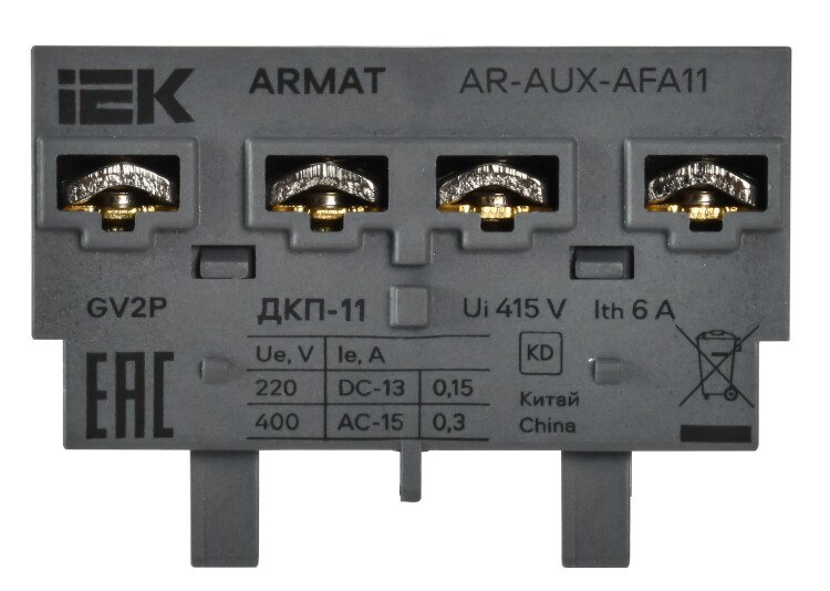 Дополнительный контакт для автоматического выключателя защиты двигателя серии ARMAT предназ начен для коммутации цепей управления и сигнализации переменного тока при изменении коммутационного состояния главных контактов.