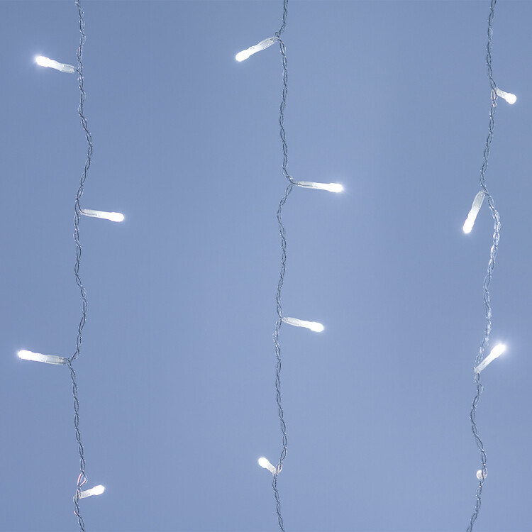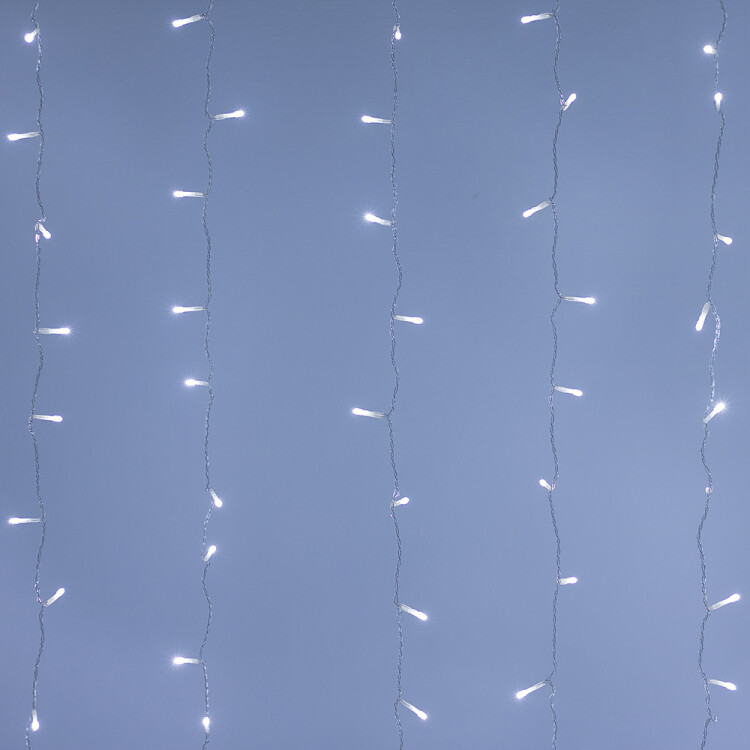 Светодиодный Занавес Home. Размер 1000x1500 мм (длина 1000 мм, высота 1500 мм). 6 ниспадающих нитей длиной 1500 мм. 96 светодиодов размером 5 мм. Цвет свечения БЕЛЫЙ (6000 К), постоянное свечение и 8 динамических эффектов с резким световым рисунком (прозрачная вогнутая линза). Провод прозрачный, ПВХ. Питание 230 В, Мощность 6 Вт, защита IP20, применение в помещении. Аксессуар для подключения и выбора режима свечения в комплекте.