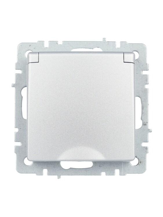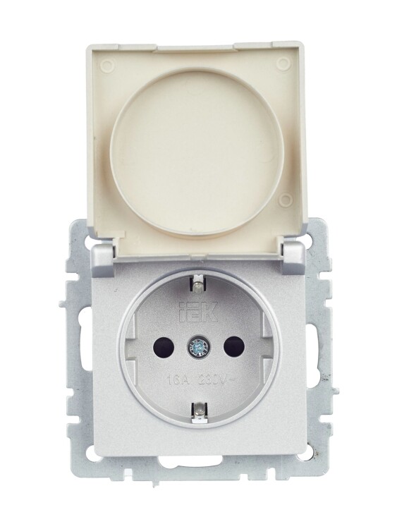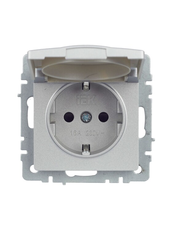 Розетка одноместная IEK РСбш10-3-44-БрА Brite (16 А, IP44) скрытой установки, с заземлением и защитными шторками, с крышкой, алюминий