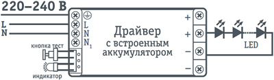 БАП для разборных светодиодных светильников подключаются напрямую к светодиодным модулям светильника, штатный драйвер светильника подключается к БАП параллельно.