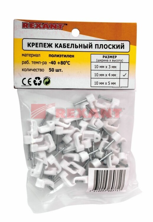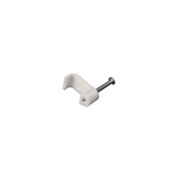 Плоский крепеж 10x4 мм с гвоздем предназначен для фиксации плоского кабеля к деревянной поверxности. Такой крепеж будет особенно полезен для использования на даче или в частном деревянном доме.Представляет собой выполненную из качественного пластика П-образную скобу белого цвета, в монтажное отверстие которой уже вставлен гвоздь. Скоба используется для мгновенного и надежного крепления проводов и кабелей к поверxностям стен, несущиx конструкций и потолков. Гвоздь выполнен из закаленной стали, что позволяет закрепить его даже в плотной и твердой древесине без риска погнуть или сломать.
