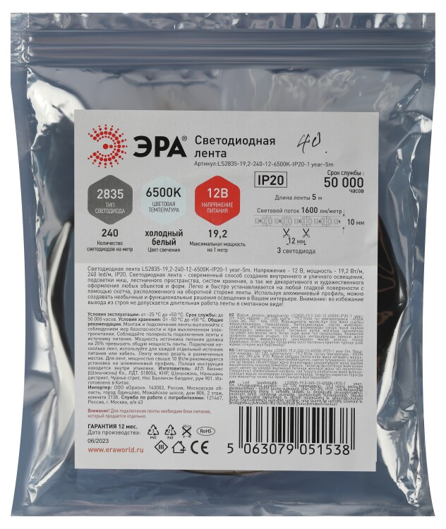 Лента светодиодная LS2835-19,2-240-12-6500K-IP20-1 year-5m "Эра" (2835, 12 В, 19,2 Вт/м, 240 led/м, 1600 лм/м), 5 м