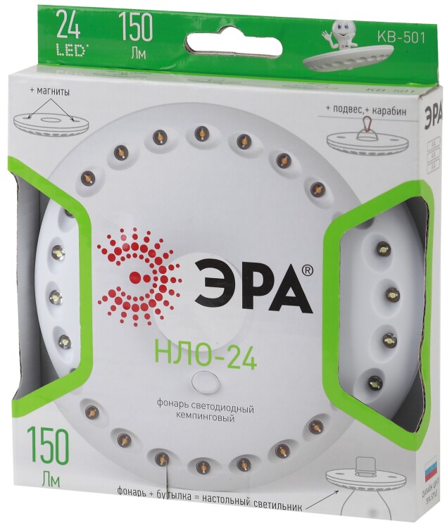 Светодиодный кемпинговый фонарь KB-501 разработан для эксплуатации на природе и в походных условиях. То есть функциональный дизайн предусматривает комфортное использование в различных ситуациях. Корпус фонаря выполнен из ударопрочного пластика, а сами светодиоды вмонтированы глубоко в корпус. Это сделано для дополнительно защиты светодиодов. Светодиоды располагаются по кругу, что позволяет осветить большую площадь, а дальность луча составляет 10 метров, при мощности в 4,4 Вт. Фонарь светит мощным, ярким и белым светом благодаря 24 качественным светодиодам. Питается от трёх батареек АА. Отверстие по центру фонаря не только придаёт фонарю современный и интересный внешний вид, но и выполняет определённую функцию. Если надеть фонарь на бутылку или любой другой предмет, то получится настольная лампа. Фонарь оборудован магнитами и крепится на металлические поверхности. В комплекте предусмотрен кронштейн для подвешивания. Универсальность в использовании делает этот фонарь практичным и надёжным инструментом в дороге. К тому же он лёгкий и достаточно компактный.