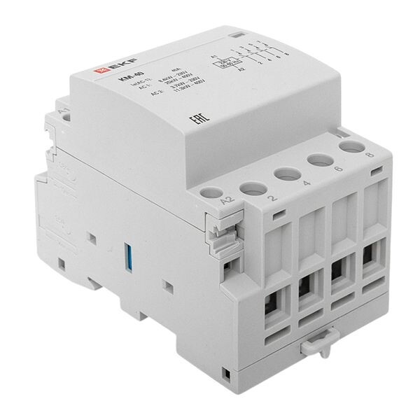 Модульные контакторы представляют из себя контактор в классическом корпусе модульного оборудования. Он состоит из неподвижных контактов, подвижных контактов, которые закреплены в подвижной части магнитной системы. Неподвижная часть магнитной системы закреплена жестко в корпусе КМ. Пружина препятствует смыканию контактов. При подаче напряжения на катушку управления в магнитной системе контактора возникает магнитное поле, которое, преодолевая сопротивление пружины, смыкает магнитную систему и замыкает контакты. При отключении напряжения с катушки управления пружина размыкает контакты. Возможна коммутация алюминиевым и медн ым проводом.