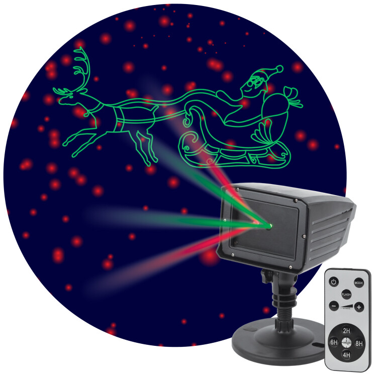 Мультирежимный лазерный новогодний проектор "Дед Мороз" (арт. Б0041643) создаёт на стенах, потолке или на фасаде здания световое изображение ключевого новогоднего персонажа - Деда Мороза. Проекция анимированная - Дед Мороз мчит на санях, запряжённых оленями. Картинка создаётся лучами двух ярких праздничных цветов - экипаж зелёного оттенка окружён красными звёздами. С помощью пульта дистанционного управления, который входит в комплект, вы можете настраивать проекцию под своё настроение: оставить полную картинку (Дед Мороз + звёзды), выбрать только сказочный экипаж (без звёзд) или включить нейтральный звёздный фон. Идеальное решение для новогодней вечеринки - режим мигания. Используйте этот практичный прибор как дома, так и на улице - он не боится осадков, пыли и мороза. В наборе 2 подставки: заострённая ножка для установки в снег или грунт + широкое основание для горизонтальной поверхности. Предусмотрены пазы для подвешивания на стену. Корпус из ударопрочного пластика. Работает прибор от стандартной сети 220 В. Шнур длиной 5 метров позволяет использовать проектор на значительном расстоянии от электросети. Специальный соединительный разъём даёт возможность дополнительно наращивать провод при помощи удлинителей. Создавайте праздничное настроение вместе с ЭРА.