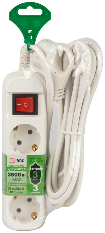 Удлинитель электрический Эра GREENLINE UDL-16-330-ES с заземлением, с выключателем, на 3 розетки, провод 3м ПВС 3x1мм2. Рассчитан на максимальную мощность 16А/3500 Вт. Удлинитель станет Вашим надежным помощником, если любимые электроприборы находятся далеко от розеток. Корпус выполнен из ударопрочного и негорючего пластика (полипропилен). Вилка обеспечена кольцом для удобного извлечения ее из розетки. Модель удлинителя на 16А позволяет подключить бытовые приборы общей нагрузкой до 3500Вт.