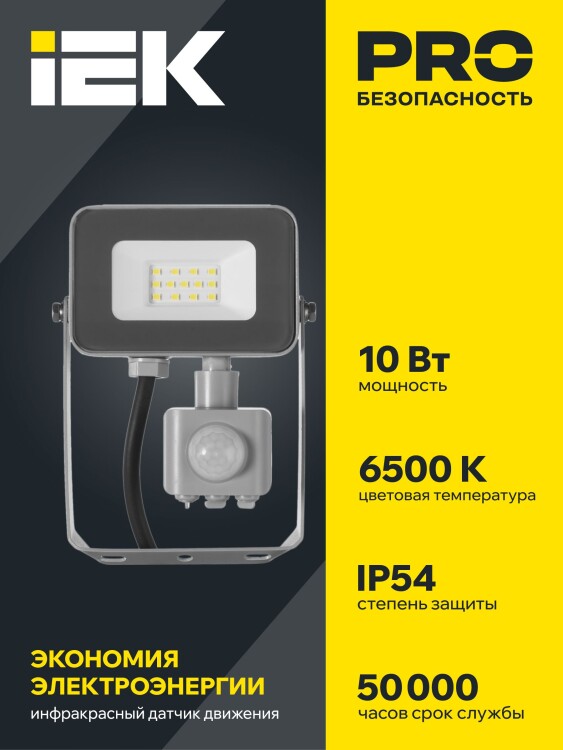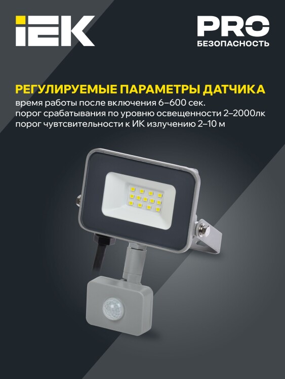 Прожектор светодиодный СДО 07-10Д IEK LPDO702-10-K03 (10 Вт, 220 В, 900 лм, 6500 К, IP54, SMD) с датчиком движения