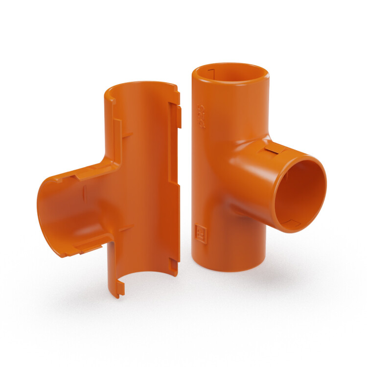 Предназначен для соединения гофрированных труб или гладких труб из пластика, образуя Т-образное ответвление, что позволяет придать более эстетичный внешний вид местам соединения. Состоит из двух частей соединяющихся друг с другом. Благодаря разъёмному корпусу, имеет возможность установки на уже смонтированную трассу. Ассортимент дополняют изделия оранжевого цвета для использования в комплекте с гладкими и гофрированными трубами в таком же цвете.