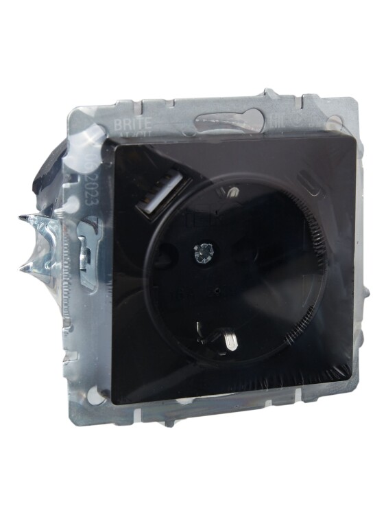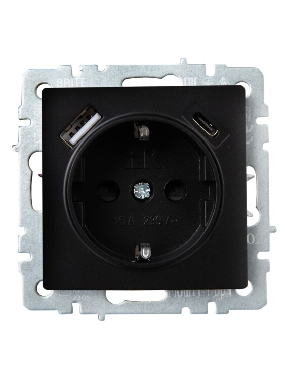 Розетка одноместная IEK РЮш11-1-БрЧ Brite (16 А, IP20) скрытой установки, с заземлением и защитными шторками, c 2 разъемами USB Type А / Type С (12 В, 3,1 А), черный