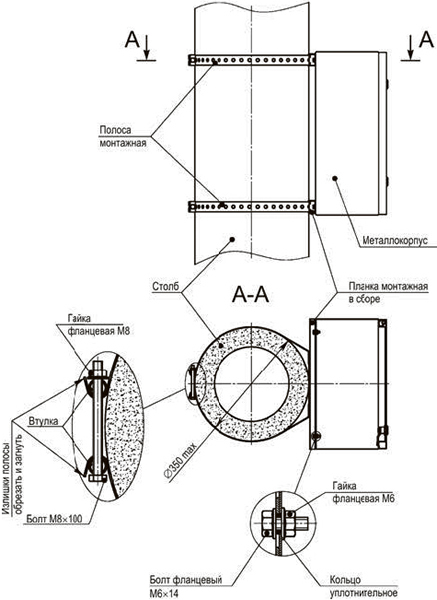 Схема крепления корпуса к столбу монтажной полосой:
