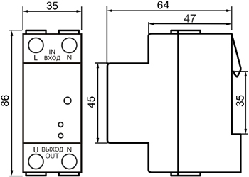 - Устройство устанавливается на монтажную DIN-рейку шириной 35 мм (ГОСТ Р МЭК 60715-2003) с передним подключением проводов питания коммутируемых электрических цепей.