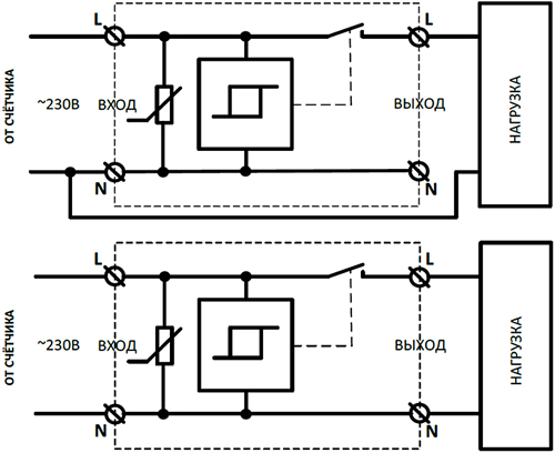 - После аварийного отключения включение реле происходит автоматически при восстановлении сетевого напряжения до нормального через 10 секунд.