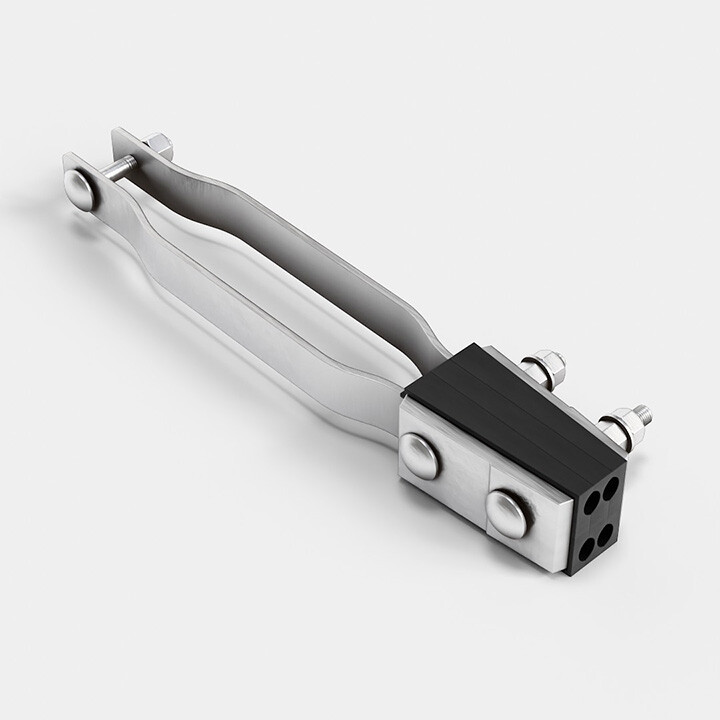 Предназначен для крепления провода СИП-4 на анкерных опорах. Зажим обеспечивает надежную фиксацию и удержание проводов путём натяжения при монтаже воздушных линий электропередач. Зажим крепится на крюках и кронштейнах с помощью единственного болта. Корпус выполнен из оцинкованной закаленной стали, что обеспечивает высокую надежность зажима и его устойчивость к механическим воздействиям. Клинья из полимера, устойчивого к ультрафиолетовому излучению, выполнены с особым рельефом, надежно фиксирующим проводник, не повреждая изоляцию. Клиновая часть зажима легко раздвигается за счет дополнительной установки пружин. Зажим выполняет роль изолятора. Фиксация жилы осуществляется путем затягивания гаек с фиксированным моментом срыва головки. Необходимый инструмент для монтажа – гаечный ключ на 17 мм. Обладает высокой прочностью, устойчивостью к ультрафиолету, коррозии, воздействию экстремальных температур, влажности и другим погодно-климатическим факторам.