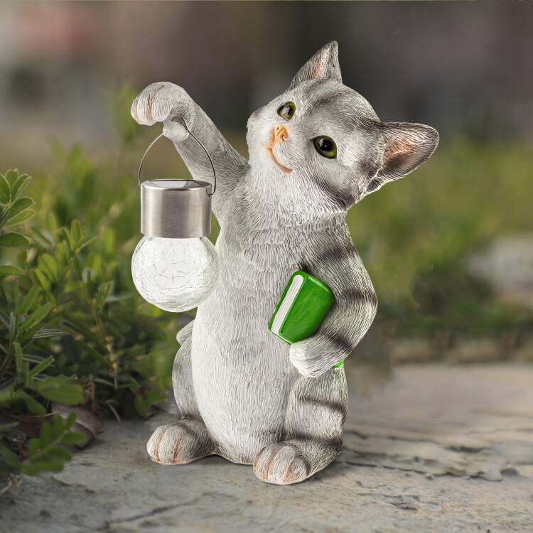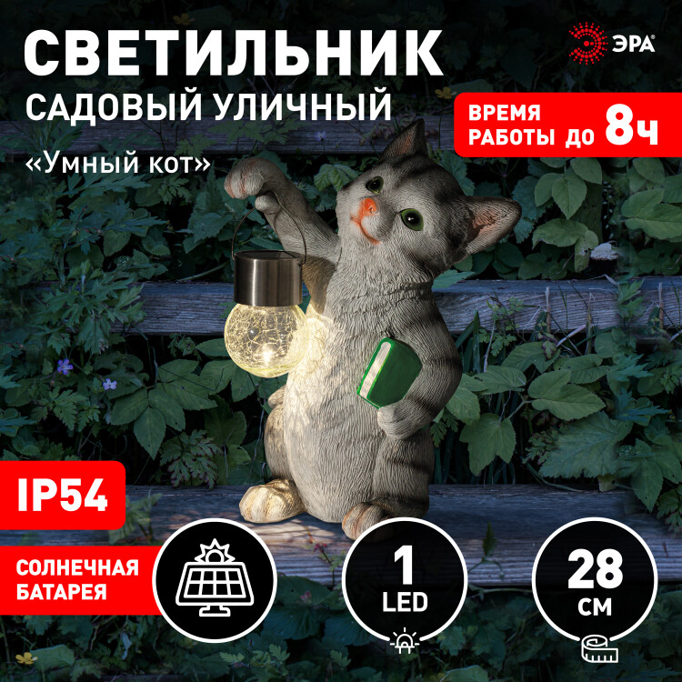 Фигурка садовая декоративная ЭРА "Умный кот" станет забавным обитателем Вашего дачного участка. Этот уличный светодиодный светильник можно разместить в саду, украсить им кустарник, альпийскую горку, подсветить тропинку или террасу на даче. Беспроводная фигурка ERASF22-10 высотой 28 см выполнена из полистоуна и максимально детализирована. Садовый фонарь работает на солнечных батареях, такой тип получения энергии является самым экологичным, энергоемким, а также бесшумным. Питание происходит во включенном режиме в солнечную погоду, с наступлением ночи фигурка сама включается и работает до 8 часов. При желании фонарик можно снять с лапки котика. Теплое свечение шара сделает ваш вечер самым уютным.