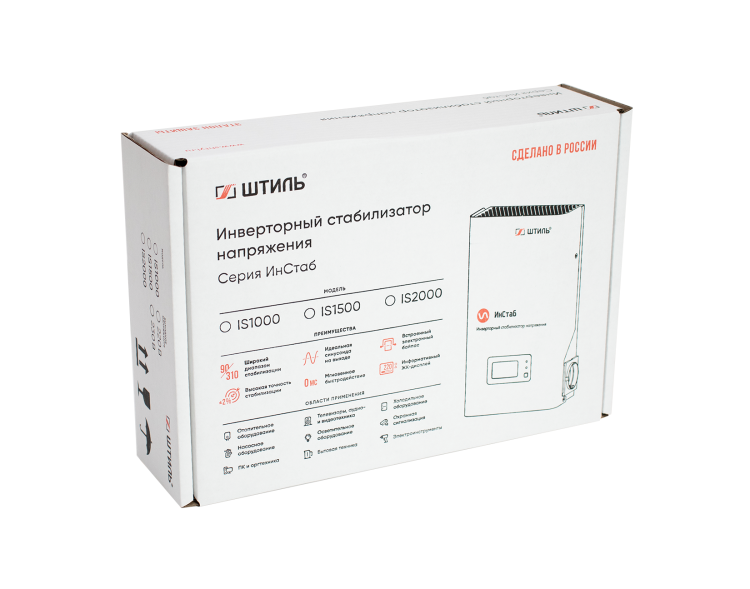 Инверторный стабилизатор напряжения Штиль IS1000 устройство нового поколения, принцип работы которого основан на технологии двойного, бестрансформаторного преобразования энергии. Он предназначен для защиты от повышенного и пониженного входного напряжения однофазных электроприборов с потребляемой мощностью не более 1000 ВА/750 Вт, например, отопительного оборудования, телевизоров, ПК, аудио- и видеотехники. Стабилизатор выполнен в универсальном конструктиве для настенной или настольной установки. Он подключается к сети с помощью кабеля длиной 1,3 м с трёхполюсной вилкой. Для подключения нагрузки на боковой панели предусмотрены две EURO розетки с заземлением. На передней панели расположены ЖК-дисплей и два светодиодных индикатора, которые позволяют контролировать основные параметры входной и выходной сети, состояние и режим работы стабилизатора. Предусмотрена электронная аварийная защита от короткого замыкания, импульсных помех, перегрузки, перегрева и аварии сети.