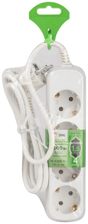Удлинитель электрический Эра GREENLINE UDL-16-415-E с заземлением, на 4 розетки, провод 1,5м ПВС 3x1мм2. Рассчитан на максимальную мощность 16А/3500 Вт. Удлинитель станет Вашим надежным помощником, если любимые электроприборы находятся далеко от розеток. Корпус выполнен из ударопрочного и негорючего пластика (полипропилен). Вилка обеспечена кольцом для удобного извлечения ее из розетки. Модель удлинителя на 16А позволяет подключить бытовые приборы общей нагрузкой до 3500Вт.