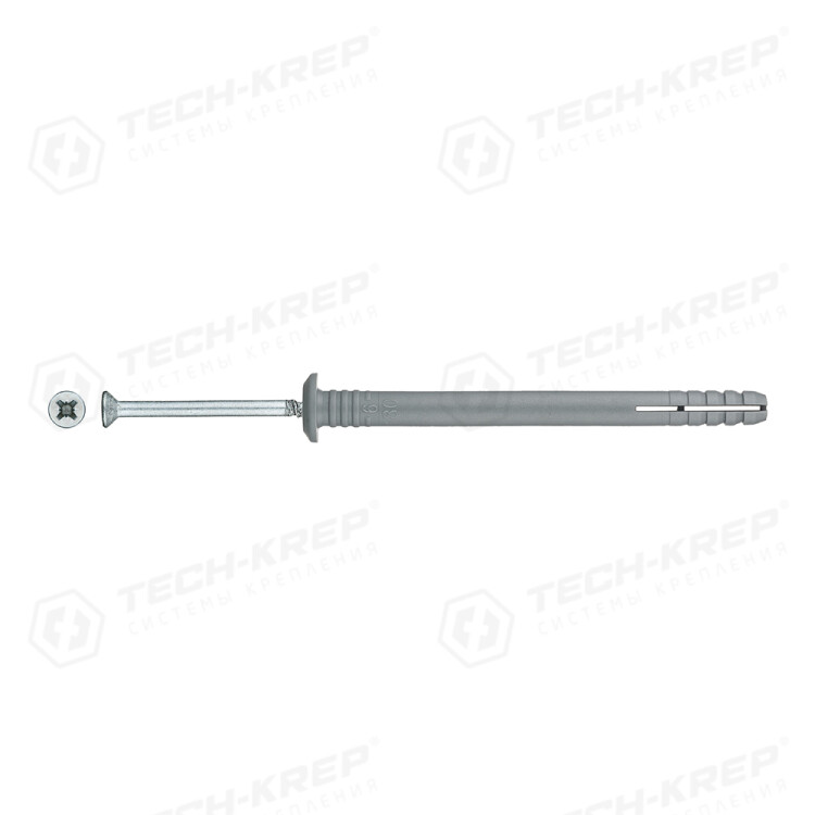 Особенности: для установки необходимо предварительно просверлить отверстие. Прочность крепежа достигается расклиниванием дюбеля в отверстии гвоздем в момент удара молотком. С помощью крестообразного шлица на головке гвоздя можно легко ослабить или усилить крепеж, демонтировать его.