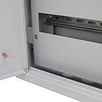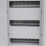 - Внутри корпуса установлены DIN-рейки типа ТН35-7,5 по ГОСТ Р МЭК 60715 для соответствующего количества электроаппаратов, элементы для крепления шин N и PE, оперативная панель.