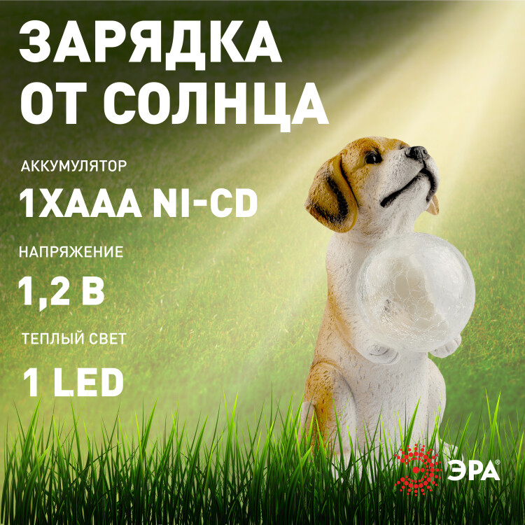 Фигурка садовая декоративная ЭРА "Золотистый ретривер" в виде забавного щенка со светильником-шаром станет милым обитателем Вашего загородного дома. Этот уличный светодиодный светильник можно разместить разместить на дачном участке - в палисаднике, украсить беседку, веранду, кустарник, изящно подсветить аллею или вход в дом. Фонарь ERASF22-011 высотой 27 см выполнен из полистоуна, все детали хорошо проработаны. Беспроводной садовый светильник работает на солнечной батарее, этот тип получения энергии является самым экологичным, энергоемким, а также бесшумным. Питание происходит во включенном режиме в солнечную погоду, фигурка сама загорается, как только стемнеет, и работает до 8 часов. При желании фонарик можно вытащить из лапок щенка. Шар с теплой подсветкой добавит уюта Вашему вечеру.