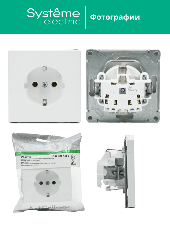 Механизм с быстрозажимными клеммами Systeme Electric серии ArtGallery в цвете белый розетки одинарной с заземлением и без шторок подходит для сетей 250 В, на ток 16 А.