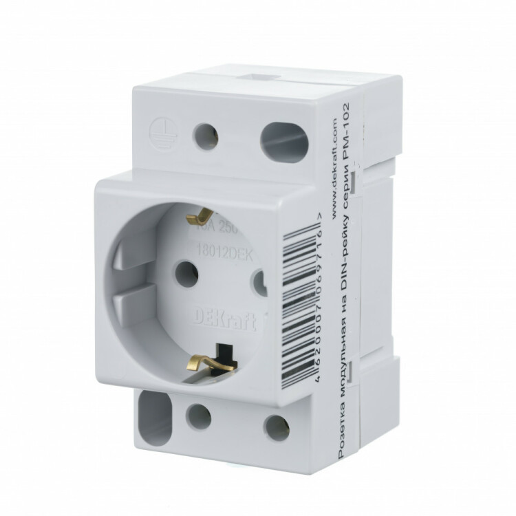 Розетка модульная серии РМ-102 Dekraft; ном.ток – 16 А; с заземляющим контактом; ширина – 45 мм; установка – на DIN-рейку; установочное положение – любое; степень защиты – IP20. Розетка модульные предназначены служит для подключения переносных светильников или электрического инструмента малой мощности во время профилактических и ремонтных работ в электрической сборке по месту установки.