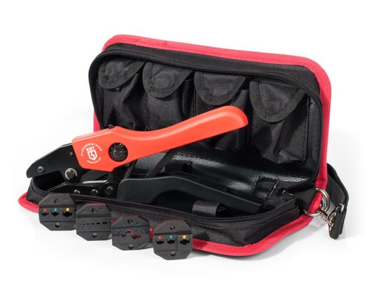 В комплекте:;пресс-клещи СТК;матрица МПК-01 для изолированных наконечников;матрица МПК-11 для изолированных разъемов;матрица МПК-02 для втулочных наконечников;матрица МПК-05 для неизолированных наконечников;сумка для инструмента с отделениями под матрицы;Сумка имеет 4 кармана с возможностью размещения 8 матриц плюс одна матрица в инструменте;Совместимость: все матрицы серии МПК (КВТ);Усиленная конструкция 9-дюймовых пресс-клещей;Храповой механизм, обеспечивающий блокировку обратного хода до завершения полного цикла опрессовки;Устройство разблокировки храпового механизма;Регулятор прижимного усилия матриц;Удобные эргономичные рукоятки;Прочная сумка с двумя карманами на лицевой стороне, кистевым ремнем и лямкой для крепления на пояс;Материал сумки: полиэстер 1680D Оксфорд;
