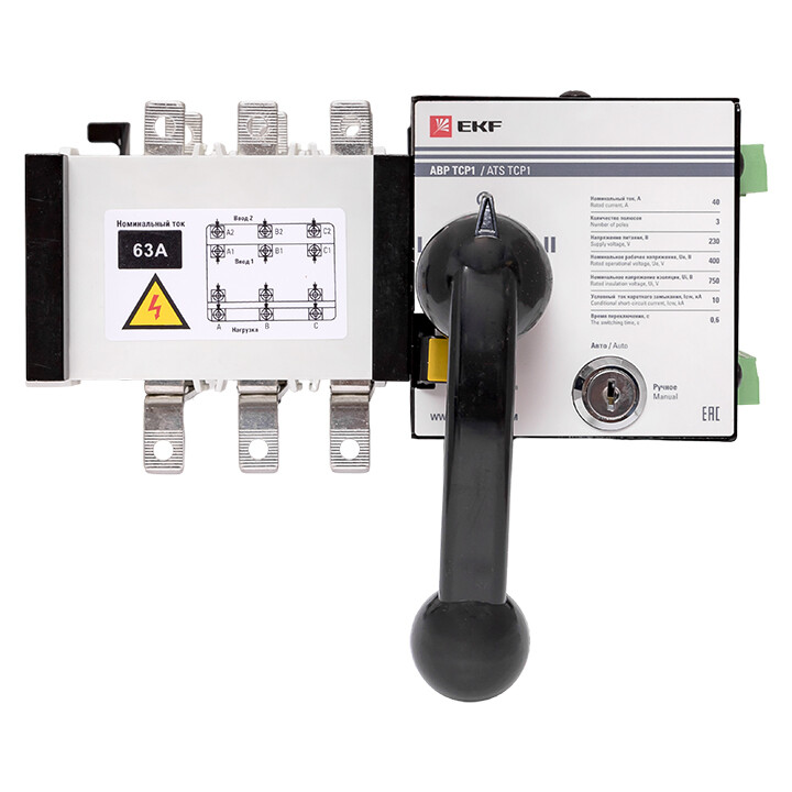 Устройство АВР торговой марки EKF предназначено для обеспечения резервным электроснабжением нагрузки, подключенной к системе электрообеспечения, имеющей основной и резервный вводы. Устройство АВР автоматически подключает резервную линию питания в случае пропадания напряжения на основной линии. Устройство АВР выполнено в виде моноблока и состоит из контактного блока и блока управления. На блоке управления имеется рычаг ручного переключения, замковый механизм перевода в ручной или автоматический режимы управления и запорный механизм, обеспечивающий блокировку переключения устройства АВР. АВР ТСР1 работает только по схеме электросеть-электросеть. Устройство АВР ТСР1 работает по схеме электросеть-электросеть. Для работы в режиме электросеть-генератор нужно подключить ДГУ к соответствующим контактам. Также контроль наличия напряжения осуществляется только по фазе А, не рекомендуется использовать данное устройство при необходимости контроля всех трёх фаз